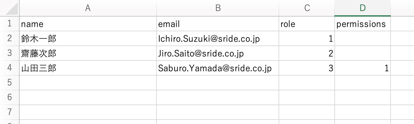 利用者の一括登録 2026年02月07日 06:53 更新 Shift-JIS形式のCSVファイルをアップロードすることで一括登録可能です。 name email role permissons 利用者の氏名 メールアドレス(利用者のログインIDになります) 1 全権管理者 2 組織管理者 3 利用者 ※ roleが利用者の場合に、1 を入力すると個人情報閲覧権限が付きます。 image.jpg 60 KB ダウンロード 関連記事 利用者に組織を一括で紐付ける ログイン方法を知りたい